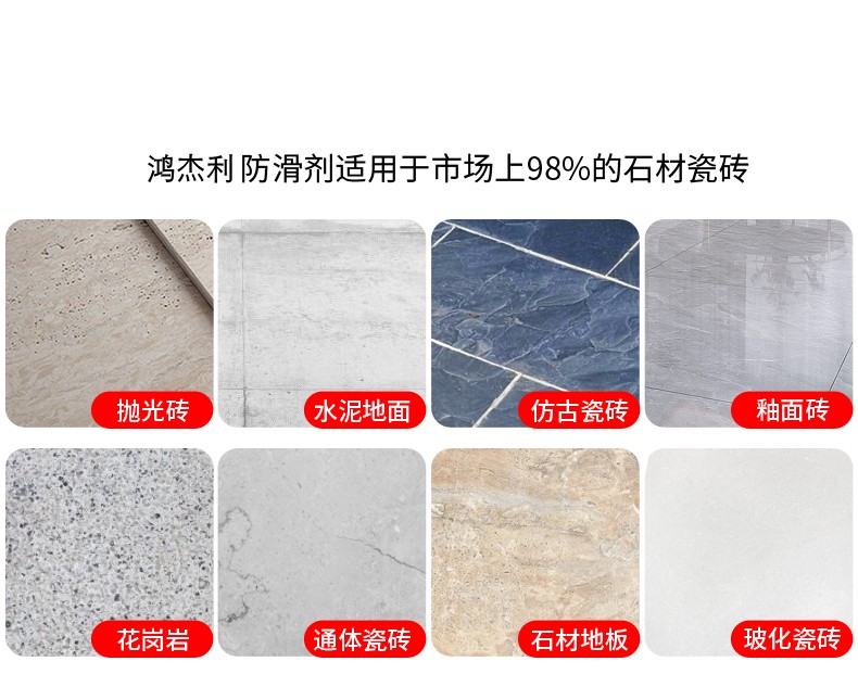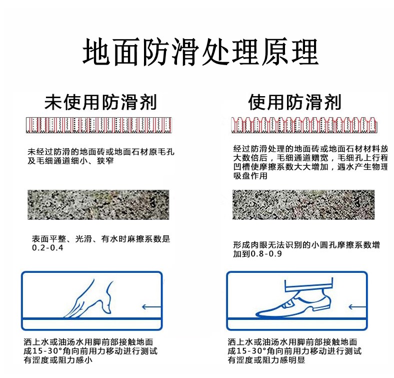 ?防滑劑原理是此液體是一種果酸提煉的環(huán)保型材料,滲透到地面材料磚表面內部去,與腳底接觸時,形成吸盤作用,達到防滑目的,摩擦系數達到0.5~0.9之間,在潮濕地面止滑使用效果非常好。